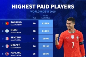 体育资讯10月18日讯 德国转会市场列出2025年球员收入榜单,C罗2.39亿欧居首,梅西1.11亿欧次席。