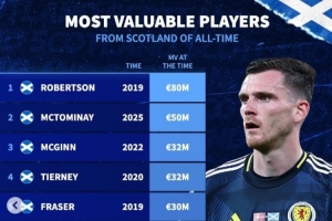 苏格兰球员历史身价:19年罗伯逊8000万欧第1,今年麦克托米奈第2